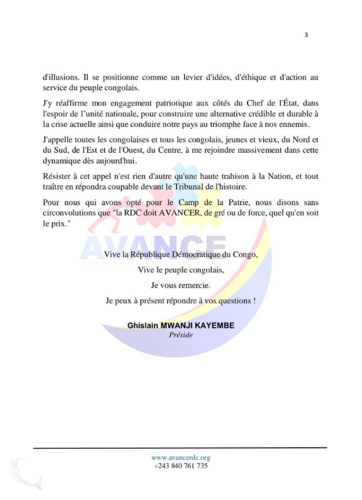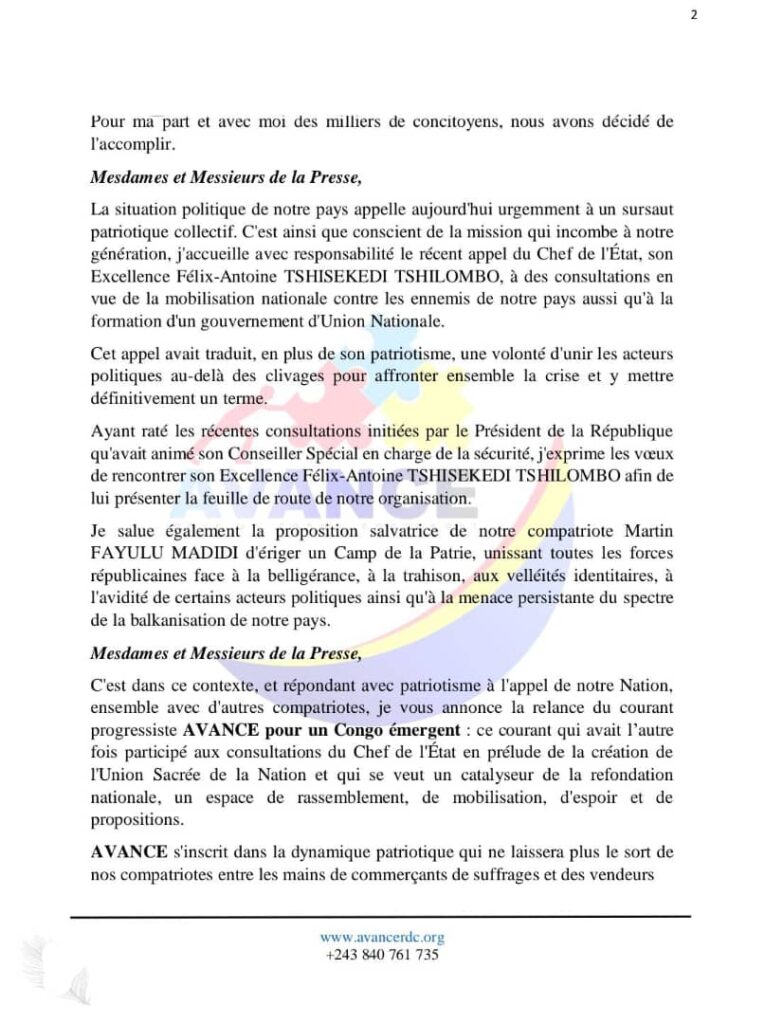 « C’est dans ce contexte, et en réponse à l’appel de la nation, que je vous annonce, avec d’autres compatriotes, la relance du courant progressiste Avance pour un Congo Émergent. Ce courant avait déjà participé aux précédentes consultations du Chef de l’État en prélude à la création du Congo nouveau. »
