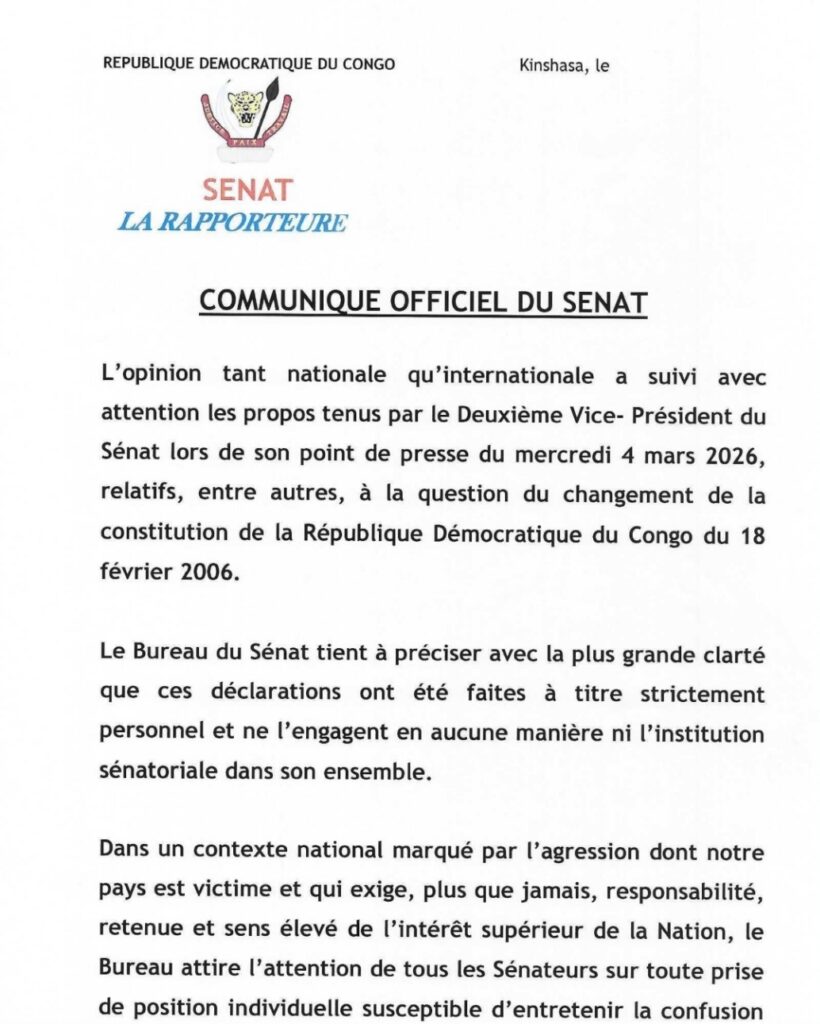Le bureau du Sénat souligne que ces propos relèvent d’une initiative strictement personnelle et ne sauraient engager l’institution dans son ensemble. Dans un contexte marqué par l’agression rwandaise contre la République démocratique du Congo, le bureau appelle à la responsabilité et à la retenue. Il met en garde les sénateurs contre toute prise de position individuelle susceptible de semer la confusion au sein de l’opinion publique.